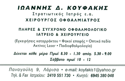 Στρατιωτικός Ιατρός Ε.Α.Πλήρες και Σύγχρονο Οφθαλμολογικό Ιατρείο και ΧειρουργείοΕγχειρήσεις Καταρράκτη, φακοί επαφής, οπτικά πεδία, ακτίνες Laser
