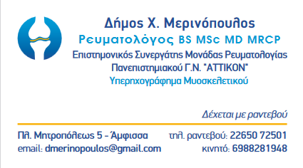 Ο Ρευματολόγος Δήμος Χ. Μερινόπουλος αποφοίτησε από την Ιατρική Σχολή του Πανεπιστημίου Κρήτης (2010) και ειδικεύτηκε στην Εσωτερική Παθολογία και Ρευματολογία στο Ηνωμένο Βασίλειο (2011-2021) με εξειδίκευση στο υπερηχογράφημα μυοσκελετικού. Διατηρεί ιδιωτικό Ιατρείο στην Άμφισσα και είναι επιστημονικός συνεργάτης στη Μονάδα Ρευματολογίας και Κλινικής Ανοσολογίας του Πανεπιστημιακού Γενικού Νοσοκομείου "ΑΤΤΙΚΟΝ". Είναι μέλος του General Medical Council (Specialist Register) του Ηνωμένου Βασιλείου, της Βρετανικής Ρευματολογικής Εταιρείας (British Society for Rheumatology), του Ιατρικού Συλλόγου Άμφισσας, της Ελληνικής Ρευματολογικής Εταιρείας και της ελληνικής ομάδας εκπαίδευσης Ρευματολόγων στο υπερηχογράφημα μυοσκελετικού, ΜΙΤΟΣ.
