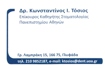 Επίκουρος Καθηγητής ΕΚΠΑ,Δέχεται καθημερινά 14:00 -20:00 με ραντεβούΟ Δρ. Κων/νος Ι. Τόσιος αποφοίτησε από την Οδοντιατρική Σχολή του Εθνικού και Καποδιστριακού Πανεπιστημίου Αθηνών το 1988, όπου ολοκλήρωσε τις μεταπτυχιακές του σπουδές και αναγορεύθηκε διδάκτορας το 1996.Το 2002 εκλέχθηκε Λέκτορας και το 2008 Επίκουρος Καθηγητής στο Εργαστήριο Στοματολογίας του Πανεπιστημίου Αθηνών. Ασκεί τη στοματολογία στο ιδιωτικό του ιατρείο από το 1996.Είναι μέλος του διοικητικού συμβουλίου της Στοματολογικής Εταιρείας της Ελλάδος, ιδρυτικό μέλος της Ελληνικής Εταιρείας Παθολογίας Στόματος, μέλος της European Association of Oral Medicine, και άλλων επιστημονικών εταιρειών.Είναι συγγραφέας σε περισσότερες από 120 επιστημονικές δημοσιεύσεις και έχει λάβει μέρος σε πολλά συνέδρια και σεμινάρια με 290 ομιλίες και ανακοινώσεις.